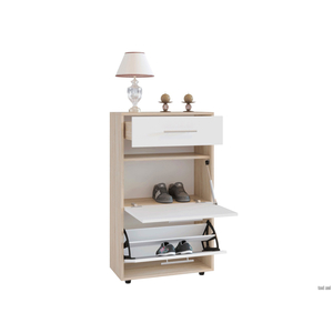 Обувница Моренго 2 объединила в себе два закрытых отделения и выдвижной ящик. Нижний отсек оснащен откидным механизмом со специальными полками для удобного хранения обуви. \n\nХарактеристики:\n \nМатериал: ЛДСП 16 мм, кромка ПВХ 0,4 мм....