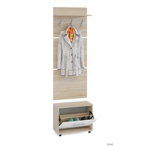Маленькая прихожая в коридор Моренго 1 выполнена в современном стиле. Она позволит разместить сезонную одежду всей семьи. Вешалка состоит из трех панелей, соединенных металлическими вставками. Полка, закрепленная над металлическими крючками для одежды, предназначена специально для головных уборов и зонтов. Максимальная нагрузка на полку составляет 5 кг.