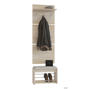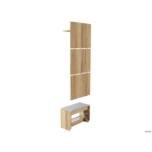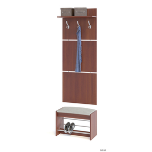 Вешалка состоит из трех панелей, соединенных металлическими вставками. Полка, закрепленная над крючками для одежды, предназначена специально для головных уборов и зонтов. Максимальная нагрузка на полку составляет 5 кг.