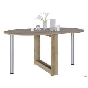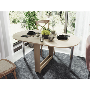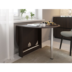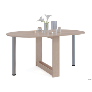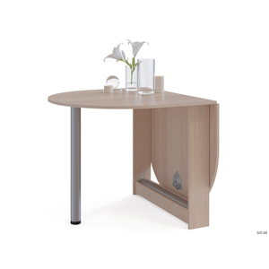 Небольшой овальный стол-книжка с откидной столешницей. Модель будет удобным элементом на небольшой кухне в квартире или в дачном домике. Отсутствие углов у столешницы снижает травмоопасность. При необходимости размеры столешницы можно увеличить, подняв крыло и прикрутив к нему ножку. В сложенном состоянии ножка хранится в специальной нише в основании стола.