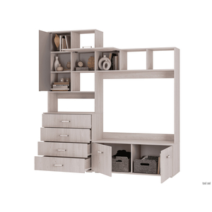Ассиметричная форма и открытые полки стенки визуально делают ее компактнее и легче. В основании предусмотрен комод с четырьмя ящиками, а также вместительное отделение за откидными дверцами.
