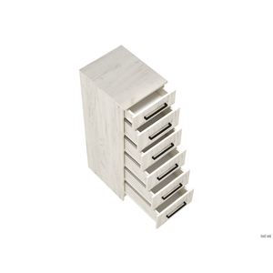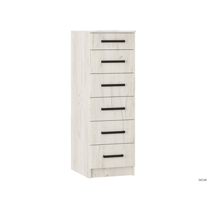 Комод Фиеста 6 ящиков поможет организовать порядок за счет большого количества выдвижных ящиков. Модель будет уместно смотреться в современной спальне, гостиной, прихожей. Узкую конструкцию можно удачно интегрировать в ограниченное пространство. Контрастные ручки дополняют дизайн, создавая небольшие акценты.