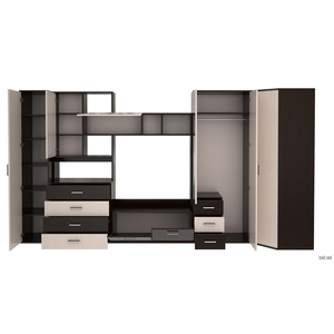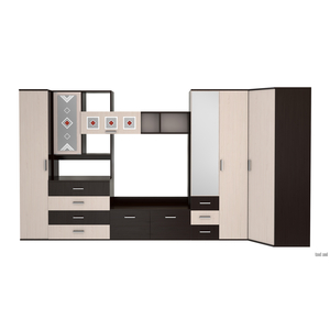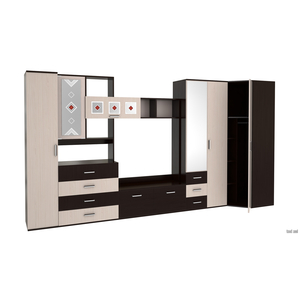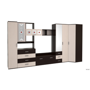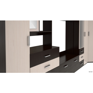 Обратите внимание, что центральная часть стенки с нишей и комодом собирается только так, как на изображении — комод слева. Остальные шкафы вы можете расположить по своему усмотрению. Боковины ящиков закромлены только с одной стороны, сборку необходимо осуществлять строго по инструкции. С инструкциями по сборке можно ознакомиться на страницах отдельных моделей. -