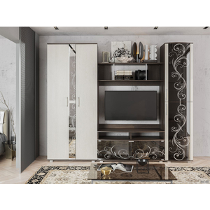 Яркая и необычная гостиная Флоренция шкафы и витрины с декоративными стеклянными фасадами и вставками. Дверцы украшены витиеватым рисунком с пескоструйной обработкой, ручки — стразами Swarovski. Крупный рисунок частично скрывает содержимое, благодаря чему можно хранить не только красивые сувениры и посуду, но и обычные вещи, необходимые в повседневной жизни. Длинные ручки удобны в использовании, при этом не отвлекают внимания от основного декора гарнитура. Вместительная и функциональная гостиная будет особенно полезна в небольшой квартире.