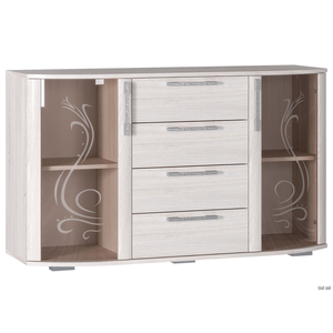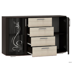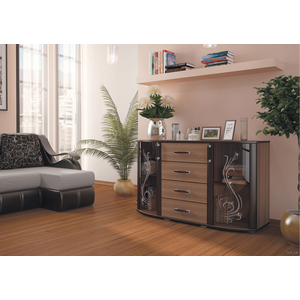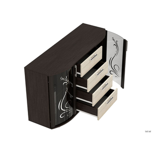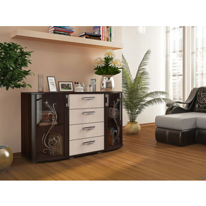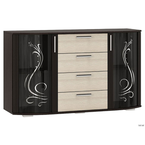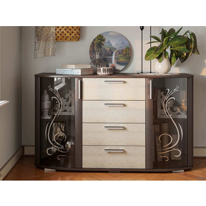 Комод Грация — настоящий идеал изящества и утонченности. Внешний вид модели пленяет, а богатое внутренне наполнение превращает в эталон функциональности. Фасады представляют собой чудесный тандем стеклянных и деревянных элементов. Центральная часть отведена под выдвижные ящики с удобными ручками. По бокам изысканно разместились распашные шкафчики с тонированными дверцами, украшенные витиеватыми узорами и стразами.