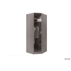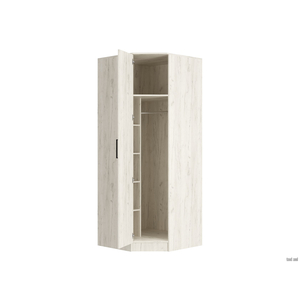 Угловой шкаф Фиеста станет полноценной системой хранения всех предметов гардероба, аксессуаров и всевозможных мелочей. Благодаря особенностям конструкции модель не занимает много места. За глухой распашной дверцей скрывается просторное и разнообразное наполнение — штанга для плечиков, открытые ниши, а также глубокая антресольная полка.