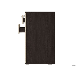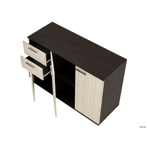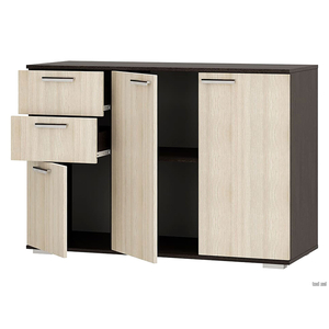 Система хранения модели представлена двумя выдвижными ящиками и тремя отделениями за распашными дверцами. Такая комплектация подойдет для хранения одежды, белья и других предметов.
