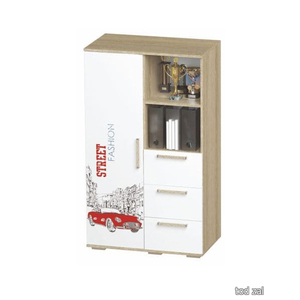 Многофункциональный детский шкаф Сенди станет удобным элементом в любой детской. На открытых полочках можно разместить игрушки, книги или награды ребенка. За распашной дверкой находится небольшая штанга для плечиков. В выдвижных ящиках можно расположить школьные принадлежности или личные вещи.