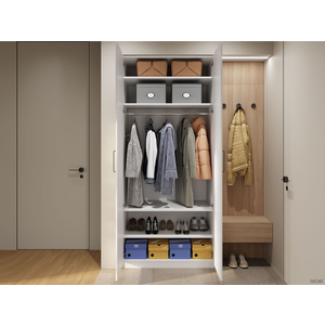 Распашной шкаф Сиена привлекает лаконичным внешним видом и продуманным внутренним наполнением. Ниша со штангой расположена на комфортной высоте в центральной части. Нижние полки отлично подходят для коробок с обувью, а антресольные — для сезонных вещей.