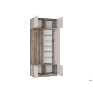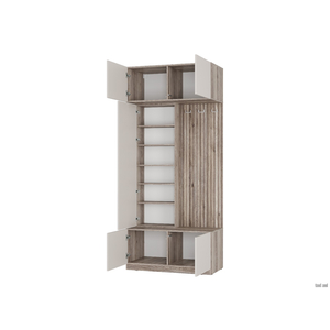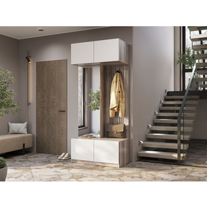 Прихожая Урбан с зеркалом станет практичным выбором для размещения верхней одежды и обуви в небольшой входной зоне. Благодаря сочетанию антресольных шкафов, обувницы и открытых крючков модель смотрится легко и аккуратно.