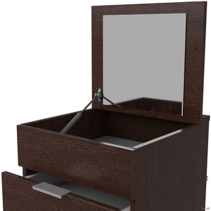 Комод Наоми-6 оснащен пятью выдвижными ящиками и отсеком с откидной крышкой с амортизатором для фиксации, откидная крышка комода оснащена зеркалом. Комод очень удобен, так как не занимает много места и совмещает в себе функции комода и трюмо.