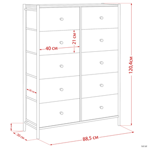 - Комод с ящиками Leset «Хайди 10» – это конструкция, обеспечивающая много места для хранения, при этом занимает мало места. Будет уместен в любом помещении и даже в ванной комнате из-за водоотталкивающей пропитке на столешнице. Модульный комод изготовлен из металлического каркаса и имеет надежные пластиковые ножки, которые сберегут пол, а также помогут отрегулировать комод по высоте. Ящики – экокожа с металлическими ручками-кнопками и нетканый материал – спанбонд, благодаря которому один ящик выдерживает 10 кг. Преимущества: • Модульность – сочетается с другими комодами Нирита; • Быстрая сборка – 10 минут. Рекомендуем прикручивать комод к стене с помощью шурупов (идут в комплекте), согласно инструкции. Это исключит возможность опрокидывания комода (особенно важно для детских комнат и помещений с маленькими детьми).