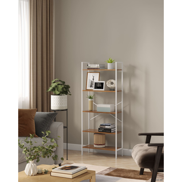 - Компактный стеллаж на 5 полок Leset Стилвуд — практичный и стильный элемент для дома и офиса. Каркас из металлического профиля 1,5 см, толщина 0,1 см с порошковым покрытием обеспечивает жёсткость и долговечность; крестовина жесткости и крепление к стене добавляют стабильности и безопасности. Полки из ЛДСП толщиной 1,6 см легко чистятся, устойчивы к царапинам и выдерживают до 20 кг каждая. Нижняя полка имеет возможность крепления на разных высотах — удобно для высоких вещей или создания композиции. Маленькая плоская упаковка делает стеллаж лёгким в переноске и сборке. Универсальный дизайн впишется в любой интерьер: 4 декора (чёрный, дуб крафт, орех, белый) и 2 цвета каркаса (белый, чёрный).